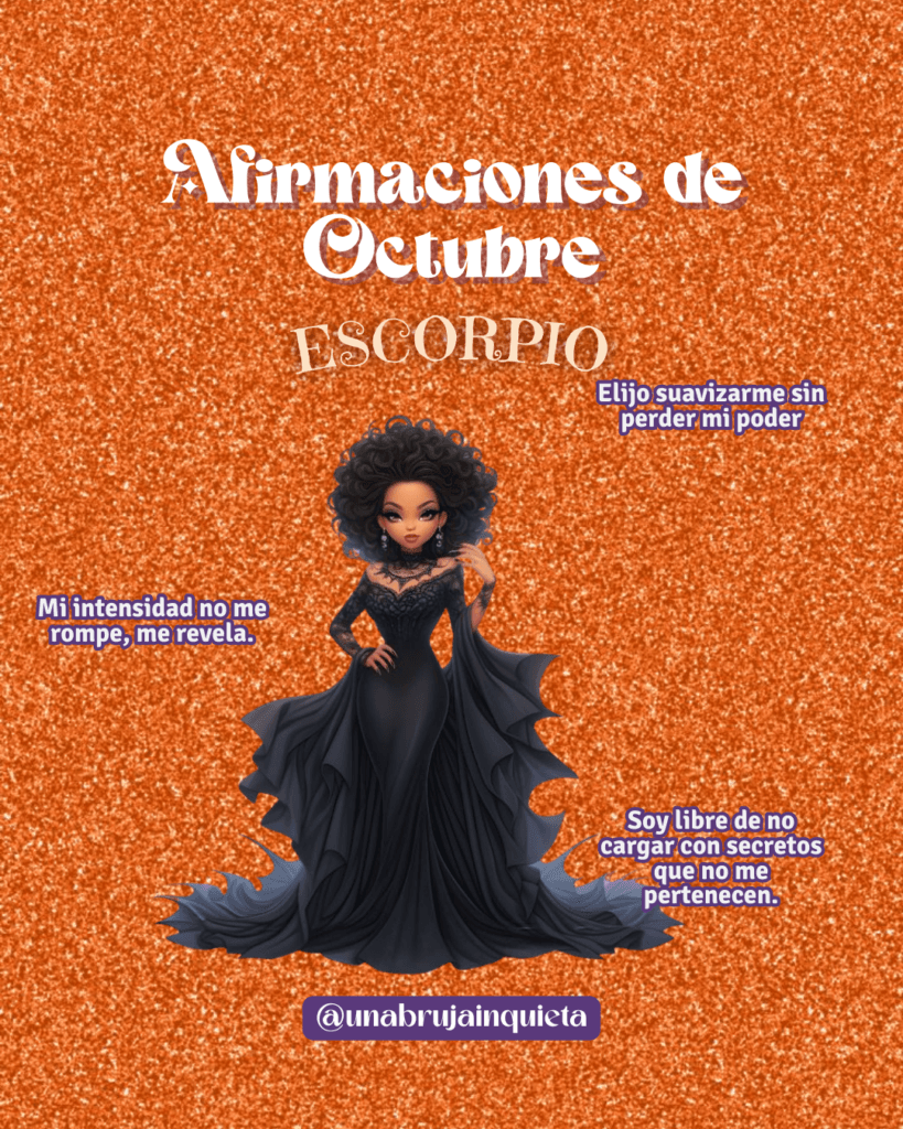 • Escorpio Elijo suavizarme sin perder mi poder. Mi intensidad no me rompe, me revela. Soy libre de no cargar con secretos que no me pertenecen.