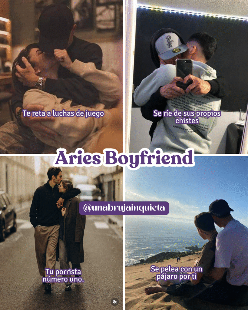Estar con un Aries es vivir en constante movimiento. Te reta a juegos y competencias solo para sacarte una sonrisa, y se ríe de sus propios chistes como si fueran los mejores del mundo. Siempre será tu porrista número uno, defendiendo tu lugar y hasta peleándose con un pájaro si hace falta. Su amor es intenso, divertido y lleno de chispa.