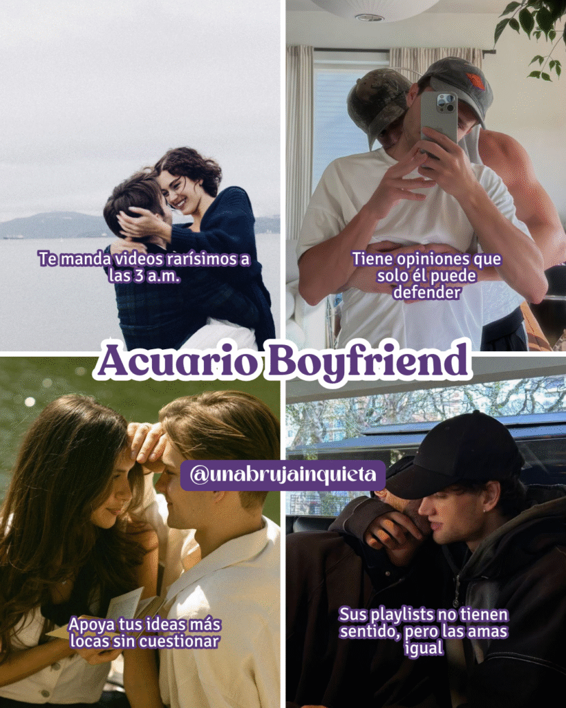 Un Acuario boyfriend es único e impredecible. Te manda videos rarísimos a las 3 a.m., tiene opiniones que solo él puede defender y apoya sin cuestionar hasta tus ideas más locas. Sus playlists no tienen ningún sentido, pero terminan convirtiéndose en la banda sonora perfecta de tu historia juntos.