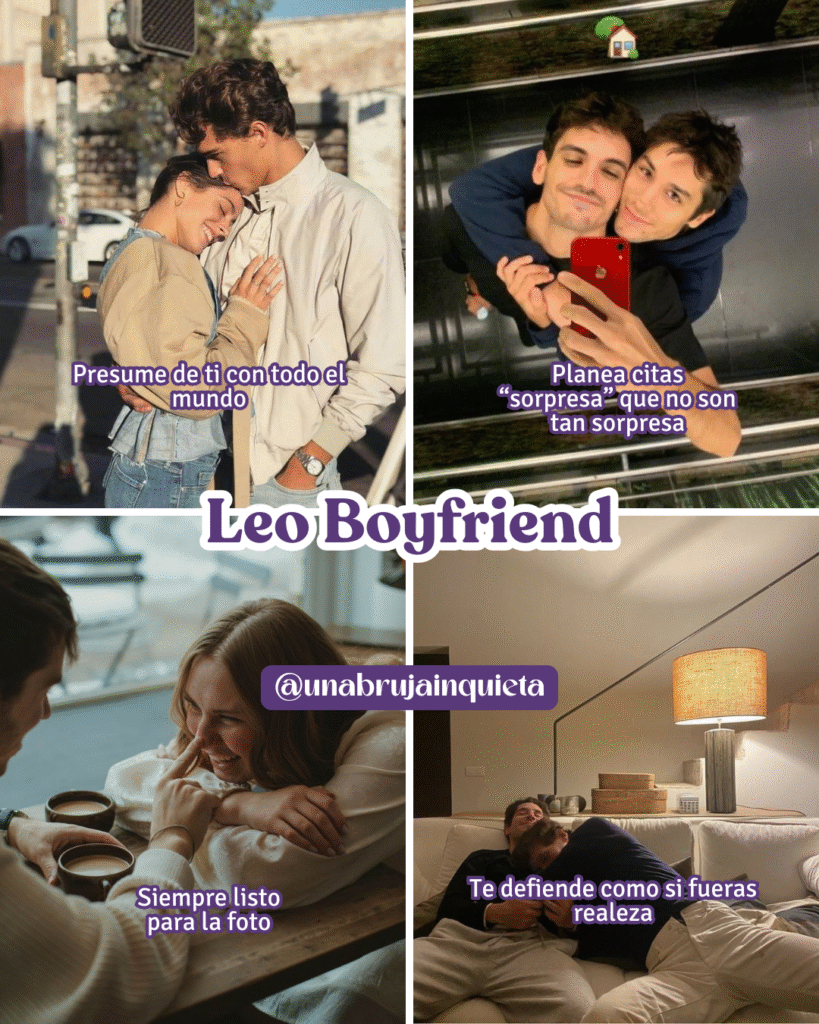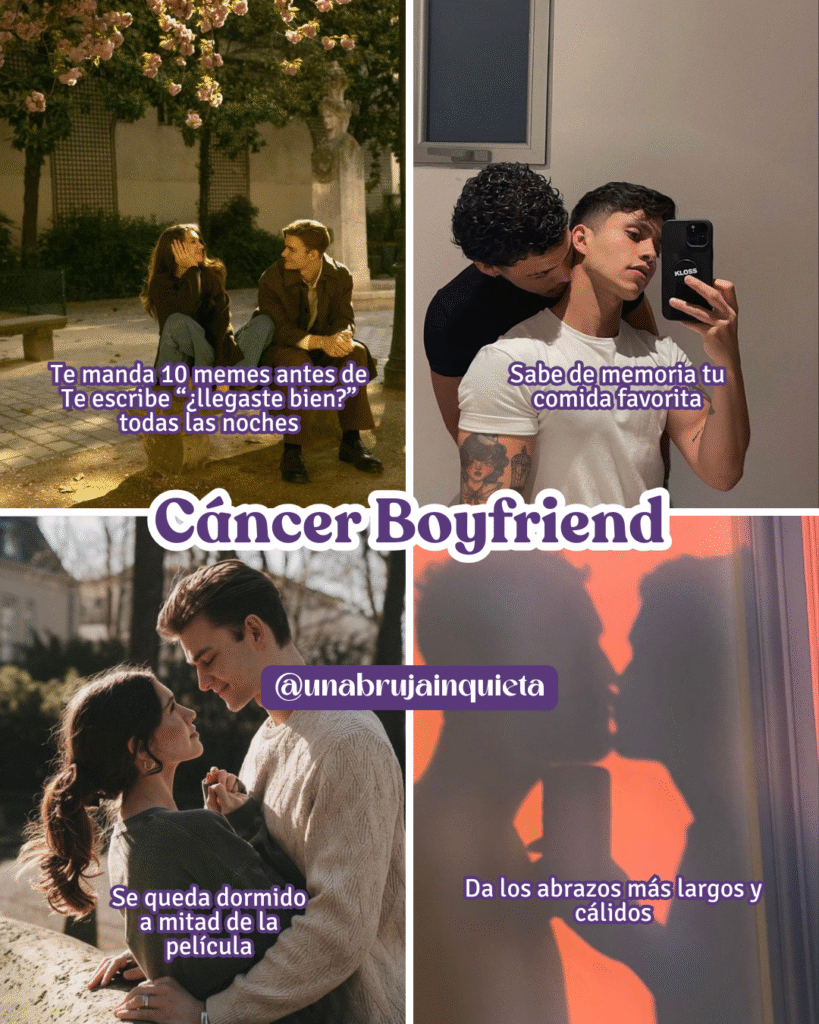 Un Cáncer boyfriend siempre está pendiente de ti. Te escribe cada noche un “¿llegaste bien?” y nunca olvida esos pequeños detalles que te hacen sentir segura. Puede quedarse dormido en medio de la película, pero nadie da abrazos tan reconfortantes como él. Su amor es protección y ternura en estado puro.