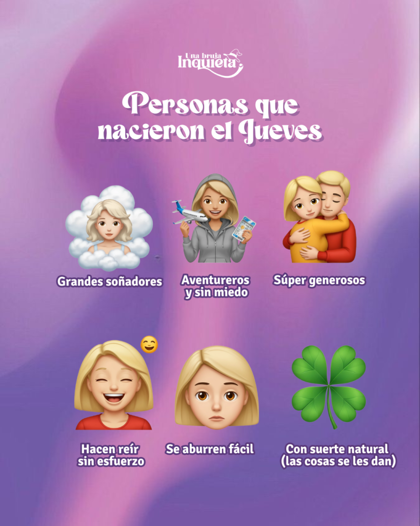 Las personas de Jueves son grandes soñadores. Son aventureros y sin miedo , y tienen una suerte natural (las cosas se les dan).
