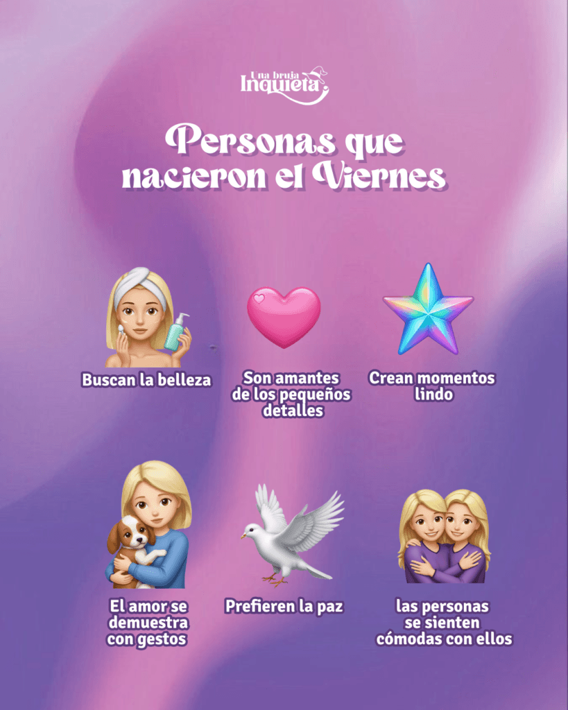 Quienes llegan al mundo un Viernes se caracterizan por buscar la belleza. Son amantes de los pequeños detalles y prefieren la paz.