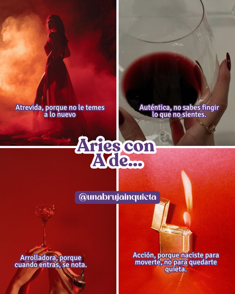 Atrevida, porque no le temes a lo nuevo. Auténtica, porque no finges lo que no sientes. Arrolladora, porque cuando llegas se nota. Acción, porque naciste para moverte, no para quedarte quieta. Aries es esa energía que abre caminos y prende la chispa que faltaba.