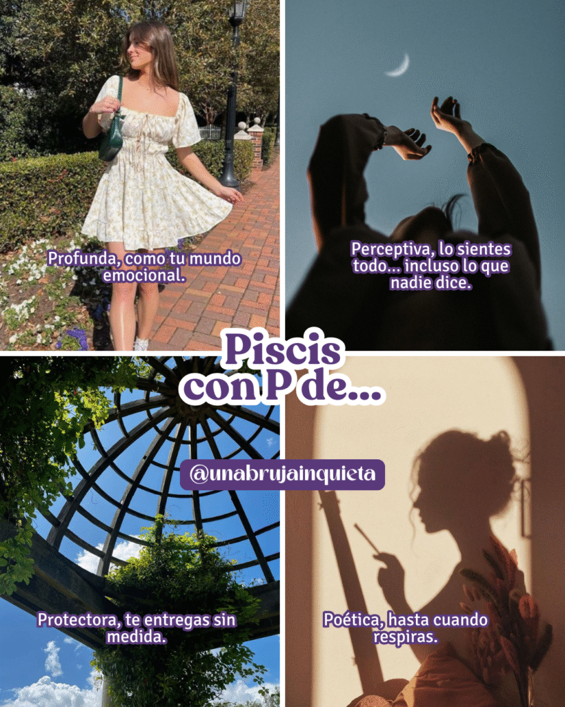 Profunda, porque tu mundo interior es infinito. Perceptiva, porque sientes incluso lo que nadie dice. Protectora, porque te entregas sin medida. Poética, porque incluso al respirar eres arte. Piscis es sensibilidad, magia y conexión espiritual.