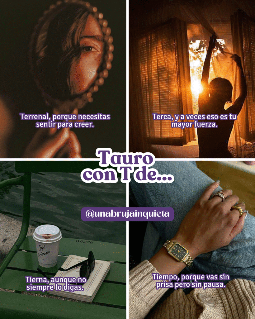 Terrenal, porque necesitas sentir para creer. Terca, y ahí radica muchas veces tu fuerza. Tierna, aunque no siempre lo digas. Tiempo, porque sabes que lo tuyo no son las prisas, sino la constancia. Tauro es la raíz firme que sostiene y enseña a disfrutar.