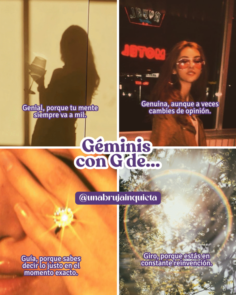Genial, porque tu mente siempre va a mil. Genuina, aunque cambies de opinión mil veces. Guía, porque sabes decir lo justo en el momento exacto. Giro, porque estás en constante reinvención. Géminis es movimiento, curiosidad y frescura que contagia.