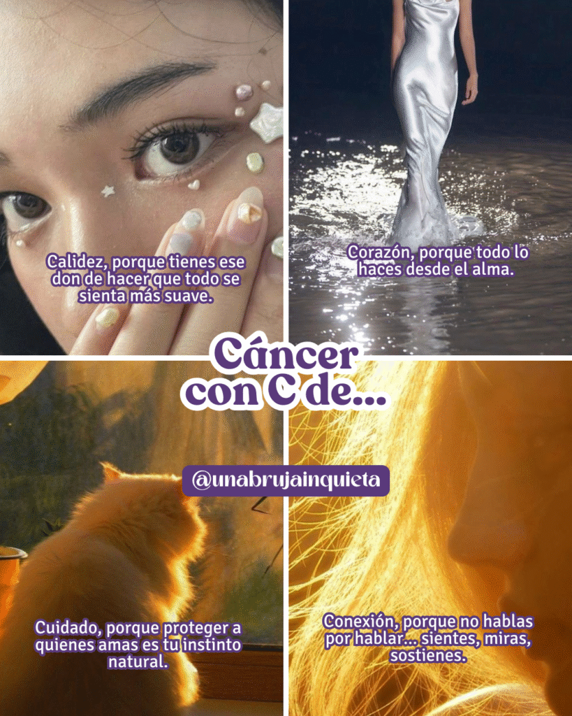 Calidez, porque suavizas hasta los días más grises. Corazón, porque todo lo haces desde el alma. Cuidado, porque proteger es tu instinto natural. Conexión, porque no hablas por hablar, sino para tocar el alma. Cáncer es el abrazo que siempre reconforta.