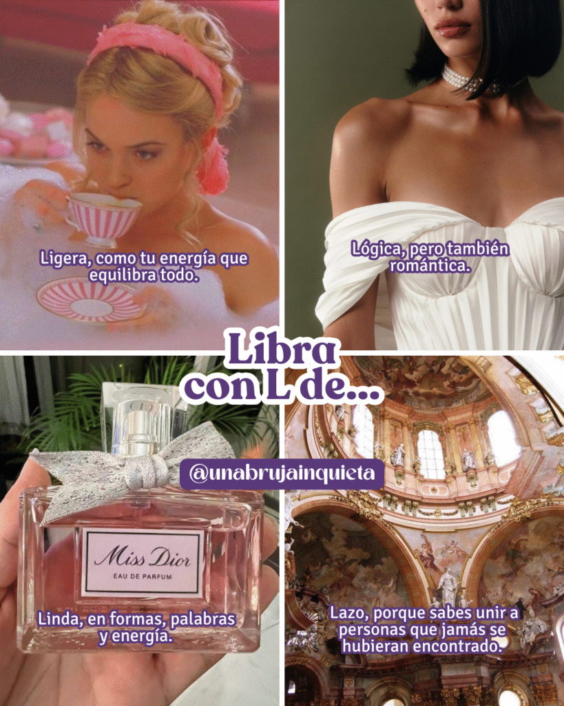 Ligera, porque tu energía equilibra lo que toca. Lógica, pero también romántica. Linda, en tu forma de hablar, de sentir y de estar. Lazo, porque sabes unir lo que parecía imposible. Libra es armonía en movimiento, un puente vivo.