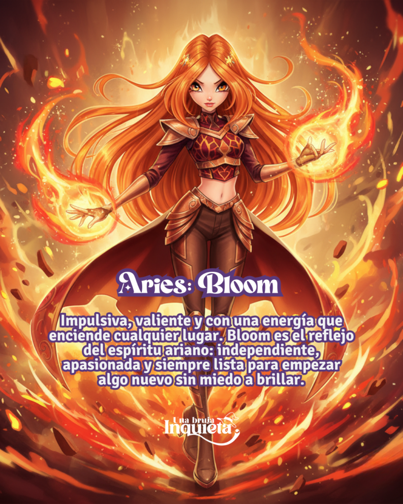 - Aries: Bloom Impulsiva, valiente y con una energía que enciende cualquier lugar. Bloom es el reflejo del espíritu ariano: independiente, apasionada y siempre lista para empezar algo nuevo sin miedo a brillar.