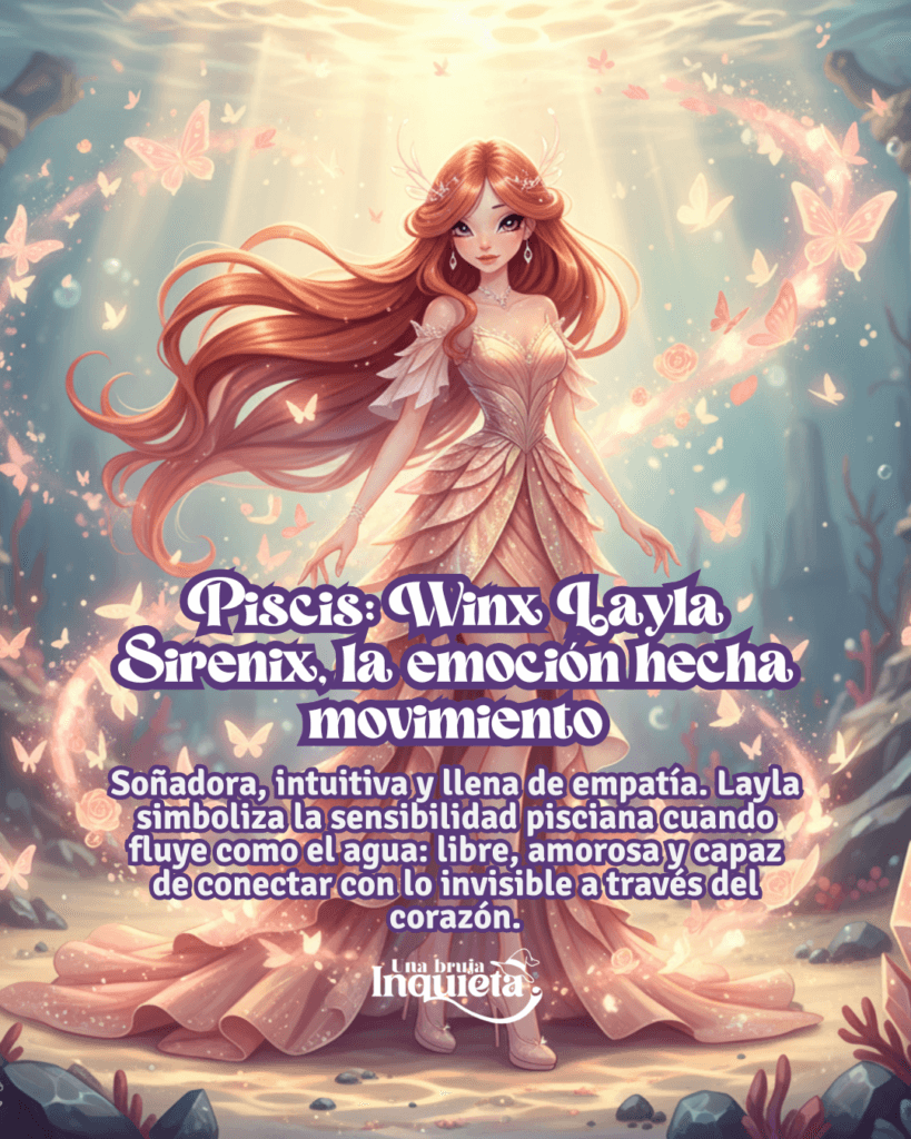 - Piscis: Layla Soñadora, intuitiva y llena de empatía. Layla simboliza la sensibilidad pisciana cuando fluye como el agua: libre, amorosa y capaz de conectar con lo invisible a través del corazón.