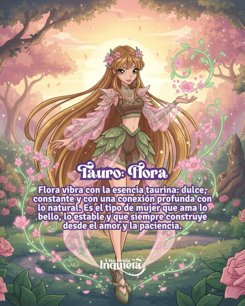 - Tauro: Flora Flora vibra con la esencia taurina: dulce, constante y con una conexión profunda con lo natural. Es el tipo de mujer que ama lo bello, lo estable y que siempre construye desde el amor y la paciencia.