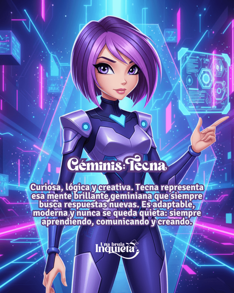 - Géminis: Tecna Curiosa, lógica y creativa. Tecna representa esa mente brillante geminiana que siempre busca respuestas nuevas. Es adaptable, moderna y nunca se queda quieta: siempre aprendiendo, comunicando y creando.