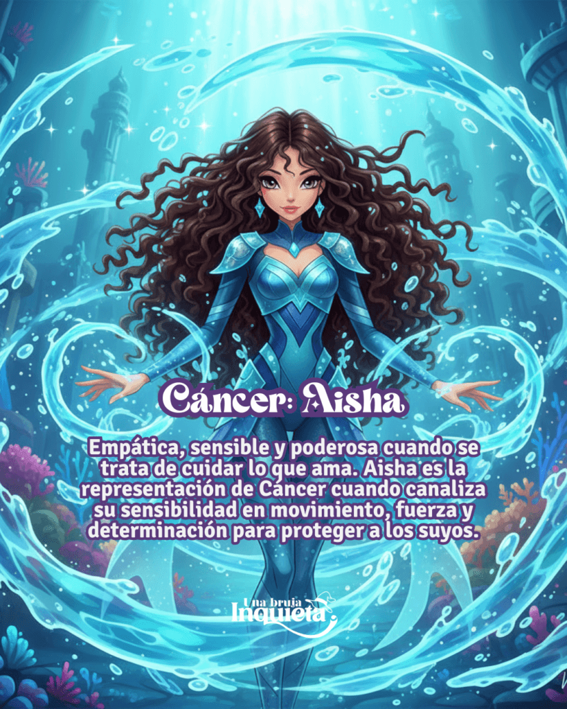 - Cáncer: Aisha Empática, sensible y poderosa cuando se trata de cuidar lo que ama. Aisha es la representación de Cáncer cuando canaliza su sensibilidad en movimiento, fuerza y determinación para proteger a los suyos.