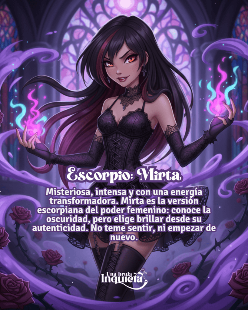 - Escorpio: Mirta Misteriosa, intensa y con una energía transformadora. Mirta es la versión escorpiana del poder femenino: conoce la oscuridad, pero elige brillar desde su autenticidad. No teme sentir, ni empezar de nuevo.