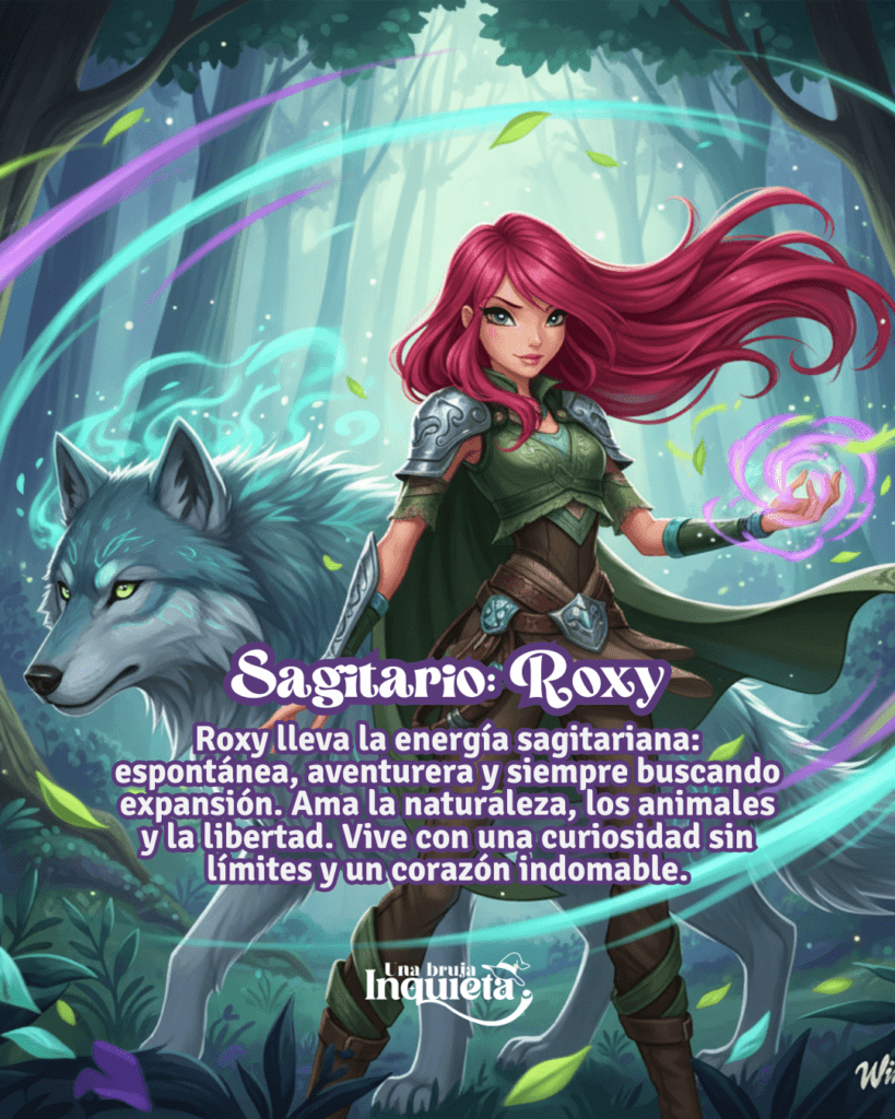 - Sagitario: Roxy Roxy lleva la energía sagitariana: espontánea, aventurera y siempre buscando expansión. Ama la naturaleza, los animales y la libertad. Vive con una curiosidad sin límites y un corazón indomable.