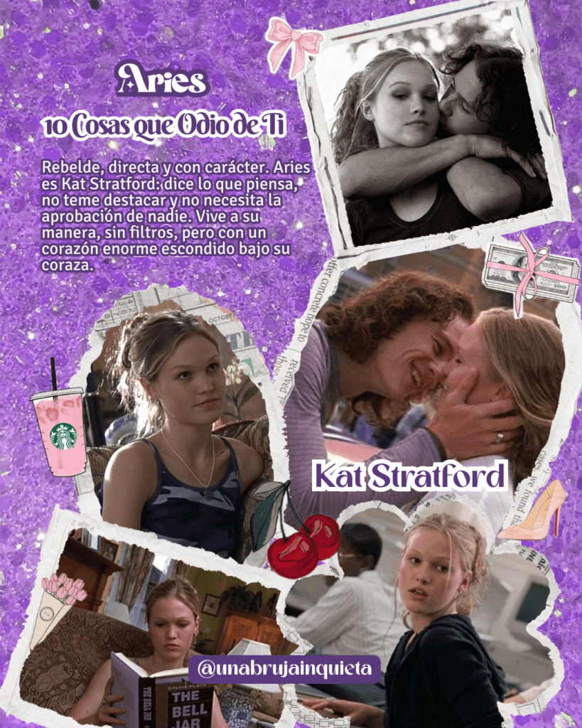 - Aries: Kat Stratford (10 Cosas que Odio de Ti) Rebelde, directa y con carácter. Aries es Kat Stratford: dice lo que piensa, no teme destacar y no necesita la aprobación de nadie. Vive a su manera, sin filtros, pero con un corazón enorme escondido bajo su coraza.