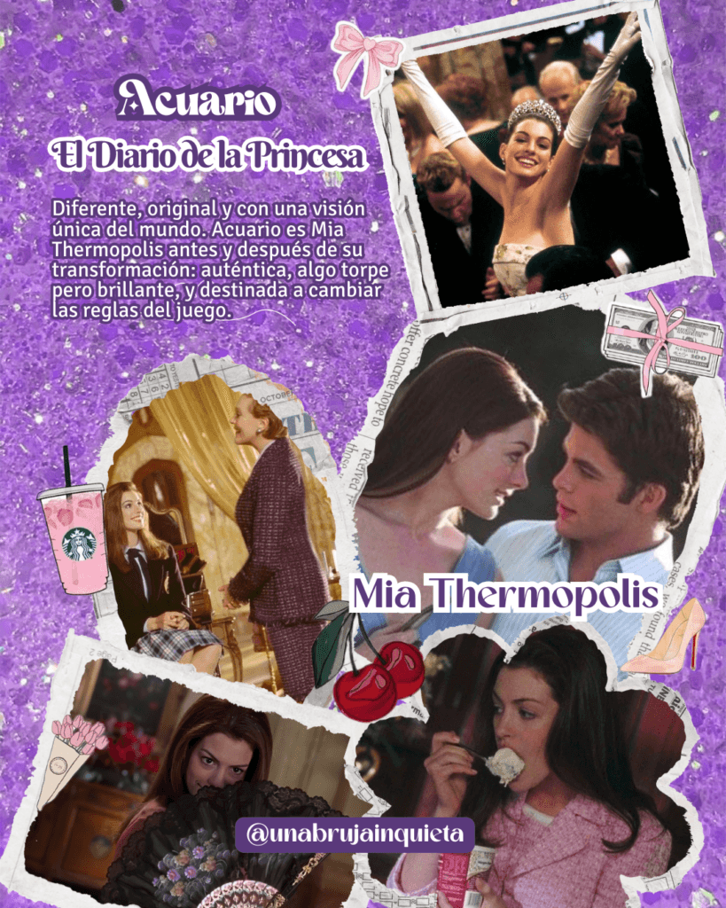 - Acuario: (El Diario de la Princesa) Diferente, original y con una visión única del mundo. Acuario es Mia Thermopolis antes y después de su transformación: auténtica, algo torpe pero brillante, y destinada a cambiar las reglas del juego.