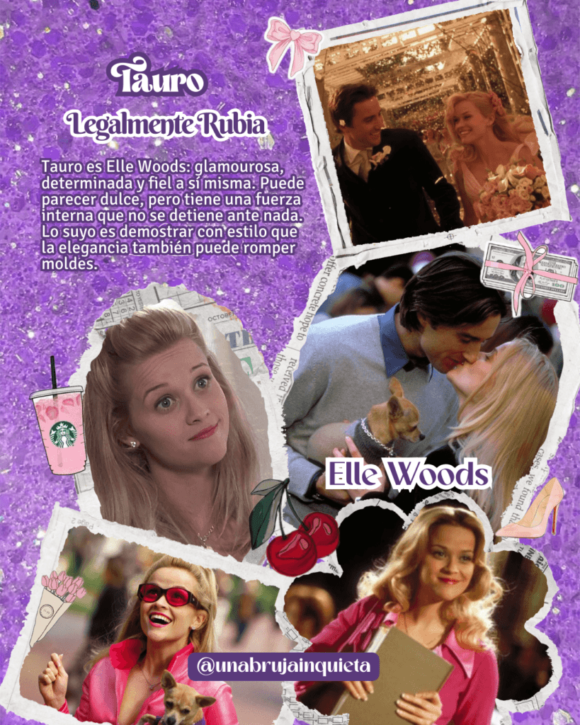 - Tauro: Elle Woods (Legalmente Rubia) Glamourosa, determinada y fiel a sí misma. Puedes parecer dulce, pero tu fuerza interna es inquebrantable. Demuestras con estilo que la elegancia y la inteligencia rompen cualquier molde.
