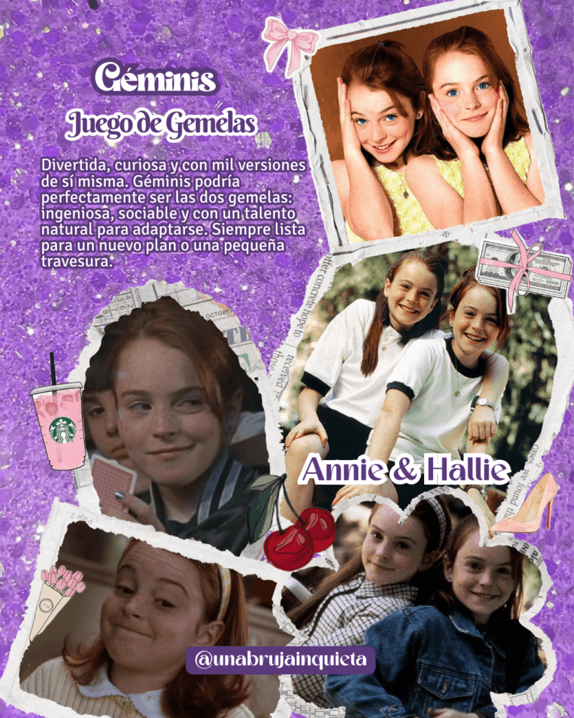 - Géminis: Las Gemelas (Juego de Gemelas) Divertida, curiosa y con mil versiones de ti misma. Eres ingeniosa, versátil y tu mente rápida te permite adaptarte a cualquier escenario. La conversación es tu mejor superpoder.