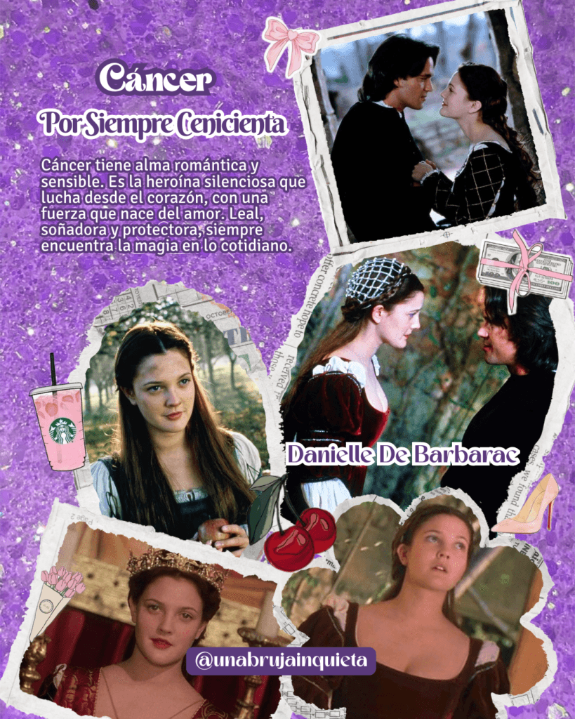 - Cáncer: (Por Siempre Cenicientan) Cáncer tiene alma romántica y sensible. Es la heroína silenciosa que lucha desde el corazón, con una fuerza que nace del amor. Leal, soñadora y protectora, siempre encuentra la magia en lo cotidiano.