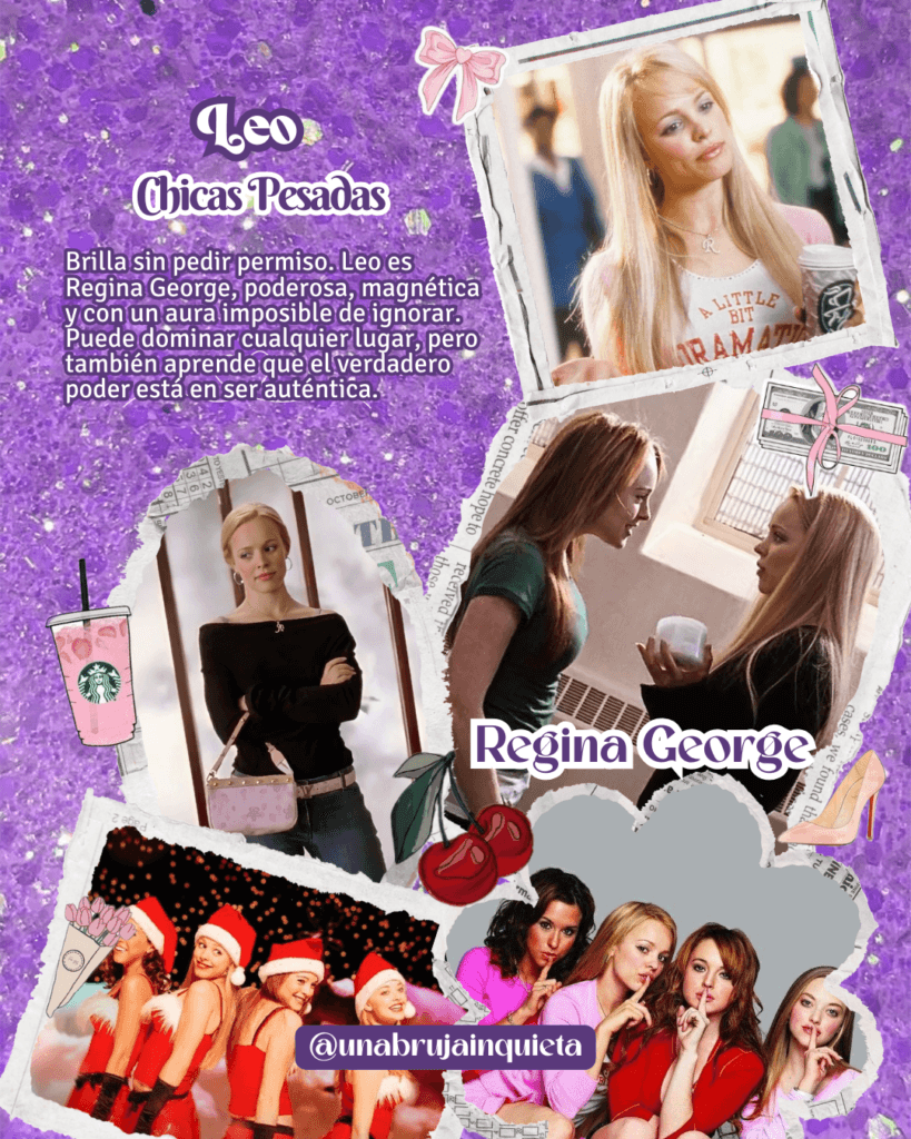 - Leo: (Chicas Pesadas) Brilla sin pedir permiso. Leo es Regina George, poderosa, magnética y con un aura imposible de ignorar. Puede dominar cualquier lugar, pero también aprende que el verdadero poder está en ser auténtica.