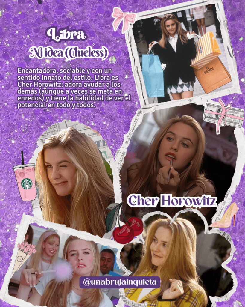 - Libra: Cher Horowitz (Clueless) Encantadora, fashionista y con un gran corazón. Buscas la armonía y la belleza en todo. Tu poder está en hacer que los demás se sientan cómodos y amados.