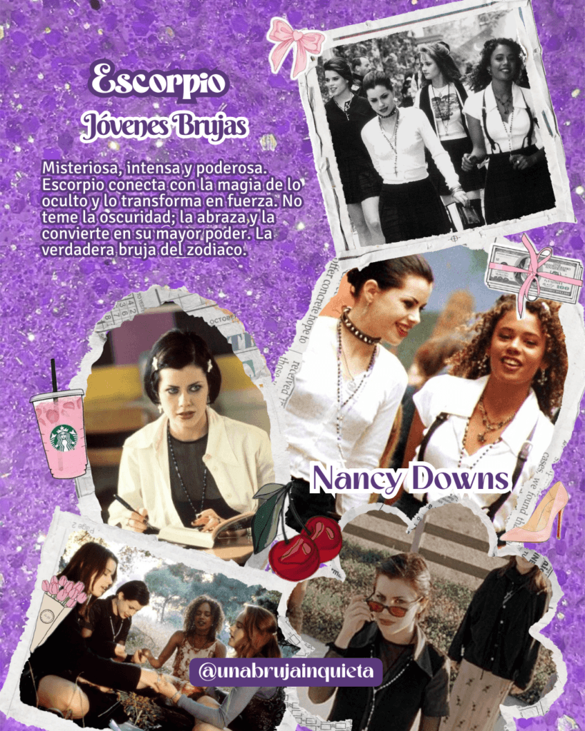 - Escorpio: Nancy Downs (Jóvenes Brujas) Misteriosa, intensa y poderosa. No temes la oscuridad; la abrazas y la conviertes en tu mayor fuerza. Eres la verdadera bruja del zodiaco, profunda y cautivadora.