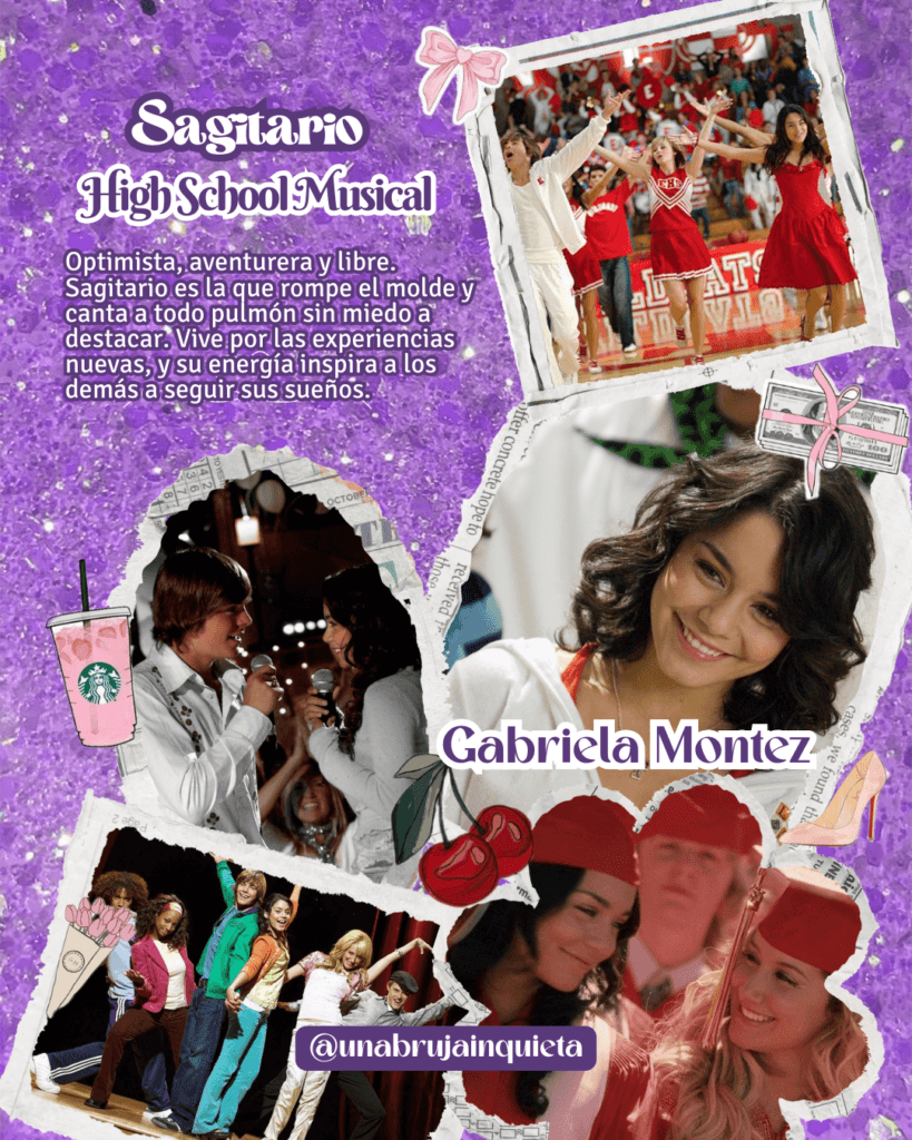 - Sagitario: Gabriela Montez (High School Musical) Optimista, aventurera y libre. Rompes el molde y cantas a todo pulmón sin miedo a destacar. Tu energía inspira a otros a seguir sus sueños, porque la vida es una gran aventura.