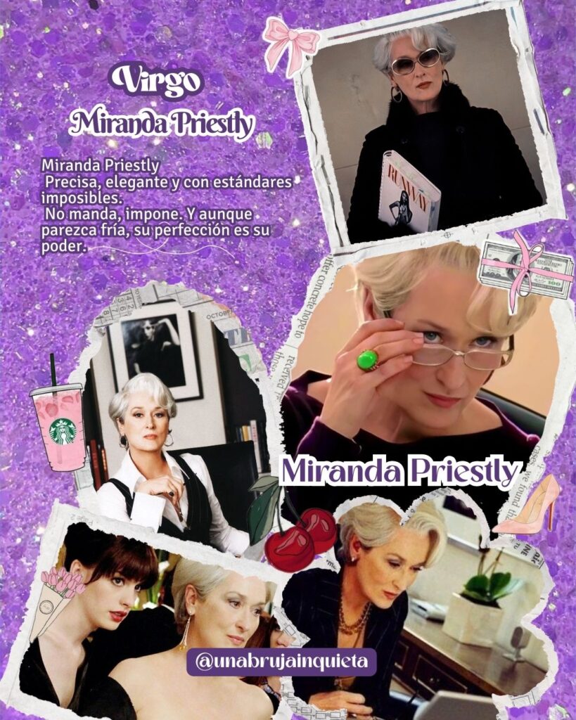 - Virgo: El diablo se viste a la moda (Miranda Priestly) Miranda Priestly Precisa, elegante y con estándares imposibles. No manda, impone. Y aunque parezca fría, su perfección es su poder.