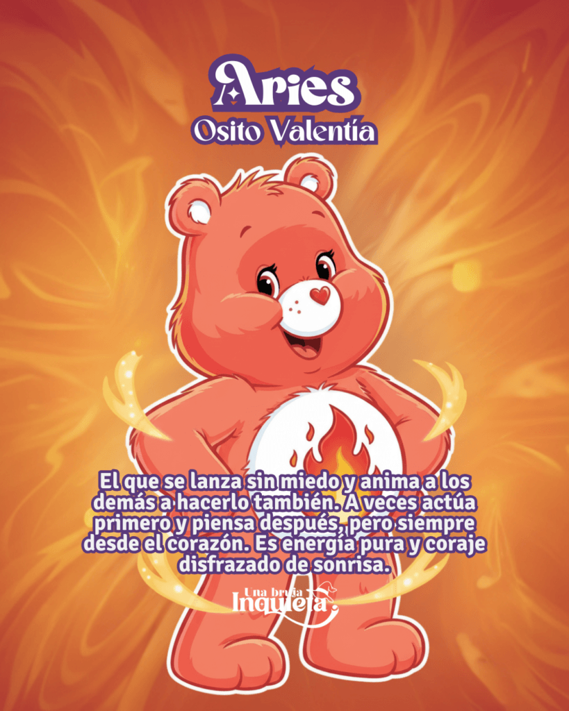 - Aries: Osito Valentía Es el que se lanza sin miedo y anima a los demás a hacerlo también. A veces actúa primero y piensa después, pero siempre desde el corazón. Es energía pura y coraje disfrazado de sonrisa.