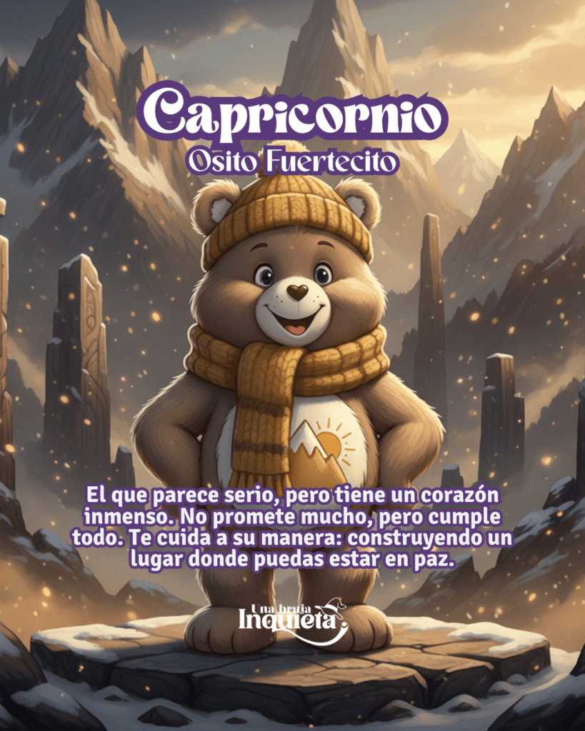 - Capricornio: Osito Fuertecito El que parece serio, pero tiene un corazón inmenso. No promete mucho, pero cumple todo. Te cuida a su manera: construyendo un lugar donde puedas estar en paz.