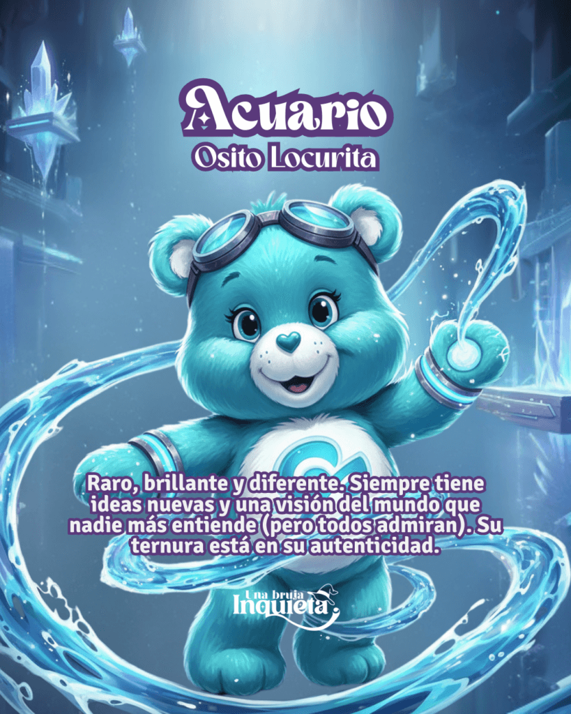 - Acuario Osito Locurita: Raro, brillante y diferente. Siempre tiene ideas nuevas y una visión del mundo que nadie más entiende (pero todos admiran). Su ternura está en su autenticidad.