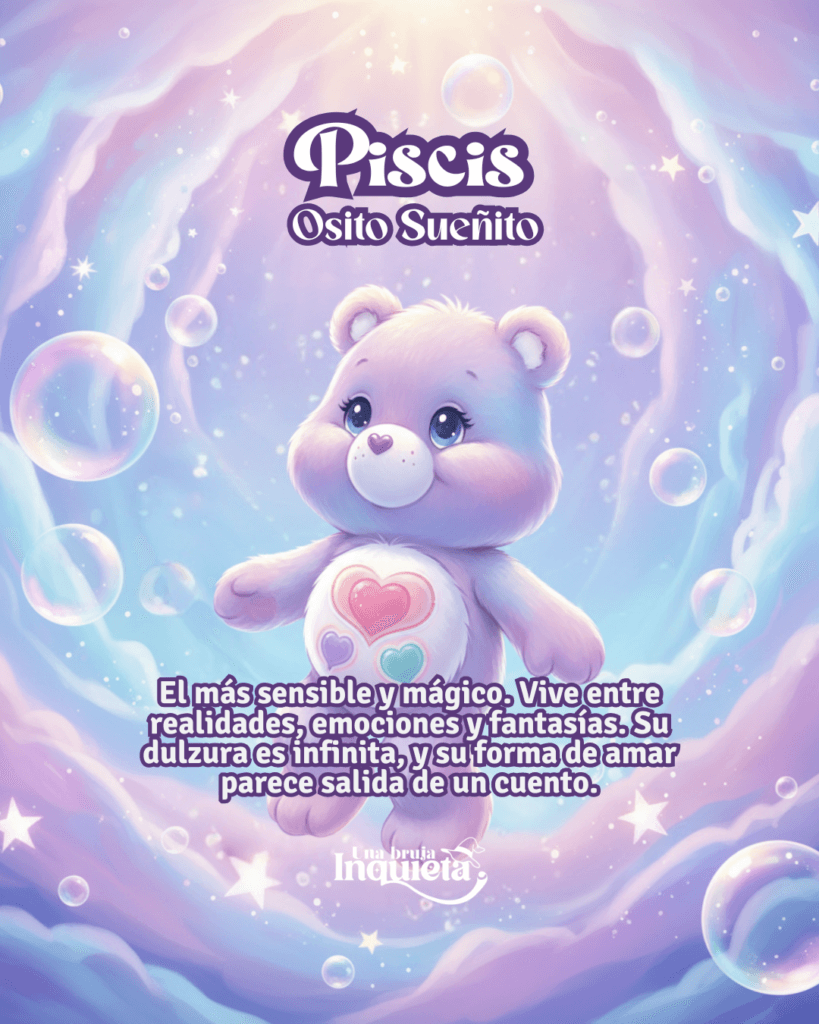 - Piscis Osito Sueñito: El más sensible y mágico. Vive entre realidades, emociones y fantasías. Su dulzura es infinita, y su forma de amar parece salida de un cuento.