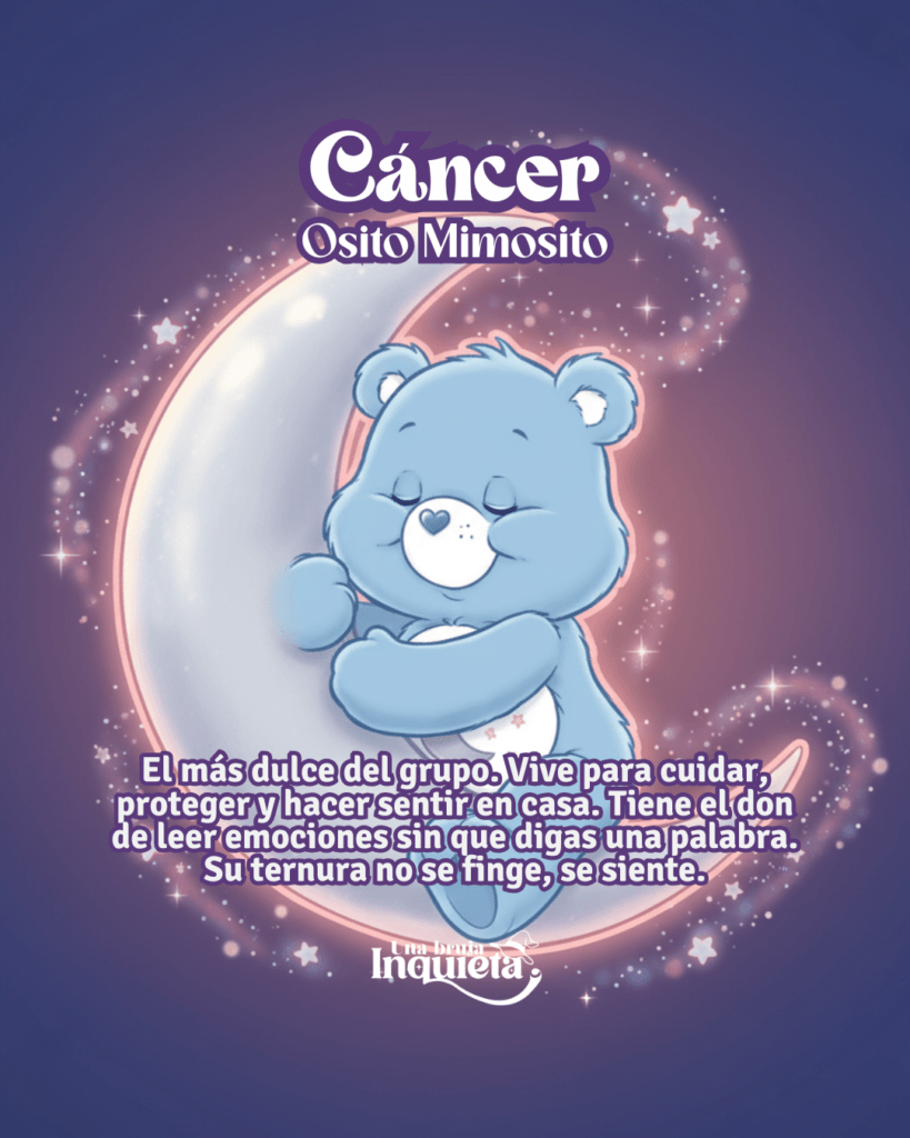 - Cáncer: Osito Mimosito El más dulce del grupo. Vive para cuidar, proteger y hacer sentir en casa. Tiene el don de leer emociones sin que digas una palabra. Su ternura no se finge, se siente.