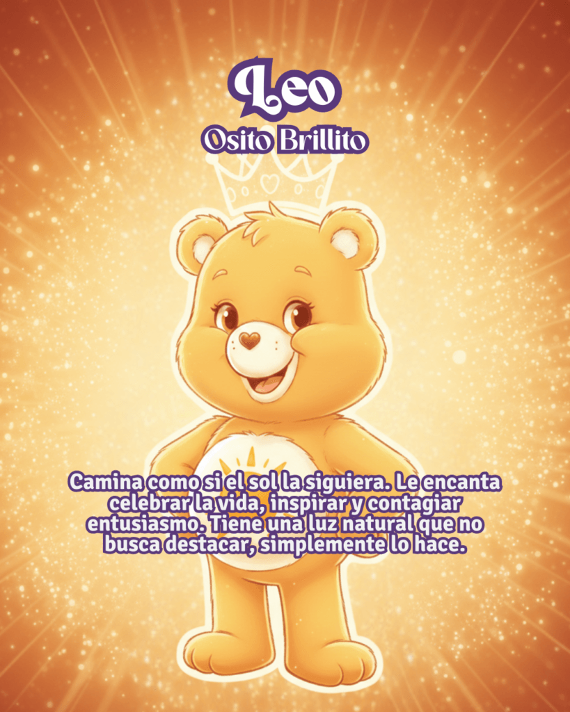 - Leo: Osito Brillito Camina como si el sol la siguiera. Le encanta celebrar la vida, inspirar y contagiar entusiasmo. Tiene una luz natural que no busca destacar, simplemente lo hace.