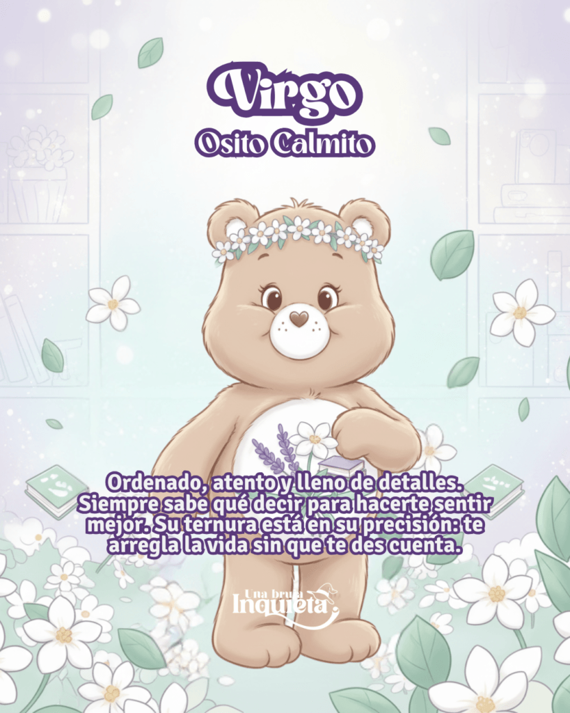 - Virgo: Osito Calmito Ordenado, atento y lleno de detalles. Siempre sabe qué decir para hacerte sentir mejor. Su ternura está en su precisión: te arregla la vida sin que te des cuenta.