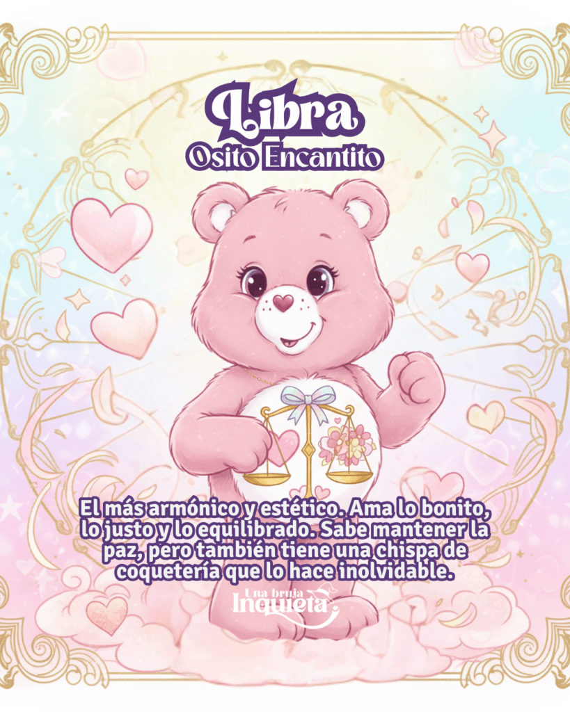 - Libra: Osito Encantito El más armónico y estético. Ama lo bonito, lo justo y lo equilibrado. Sabe mantener la paz, pero también tiene una chispa de coquetería que lo hace inolvidable.