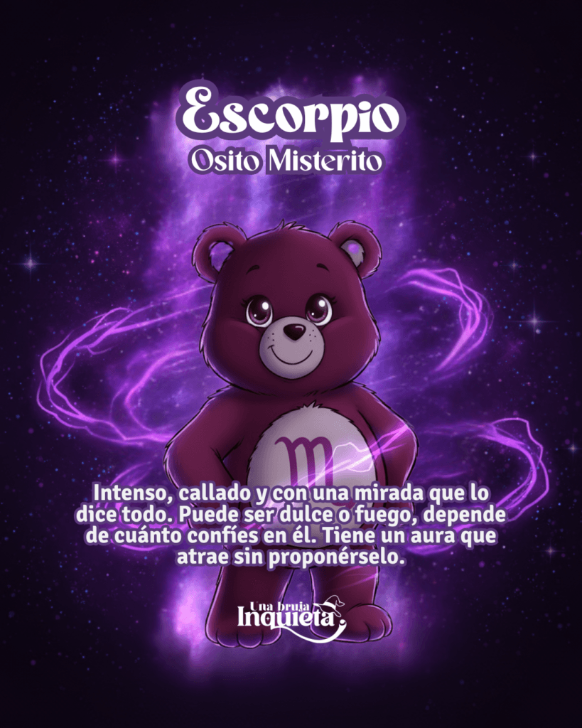- Escorpio: Osito Misterito Intenso, callado y con una mirada que lo dice todo. Puede ser dulce o fuego, depende de cuánto confíes en él. Tiene un aura que atrae sin proponérselo.