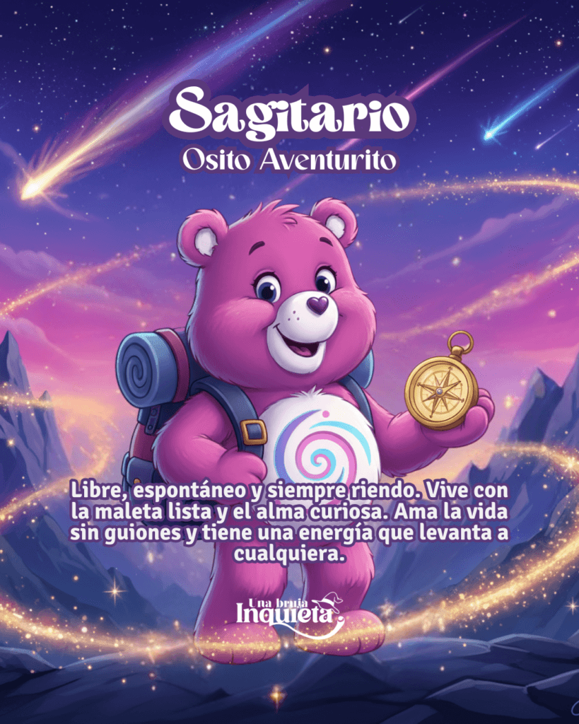 - Sagitario: Osito Aventurito Libre, espontáneo y siempre riendo. Vive con la maleta lista y el alma curiosa. Ama la vida sin guiones y tiene una energía que levanta a cualquiera.